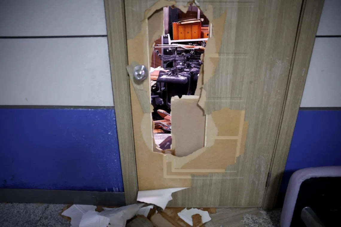 Furniture piled up behind a door which was damaged when military forces broke into the National Assembly building, after South Korean President Yoon Suk Yeol declared martial law.
