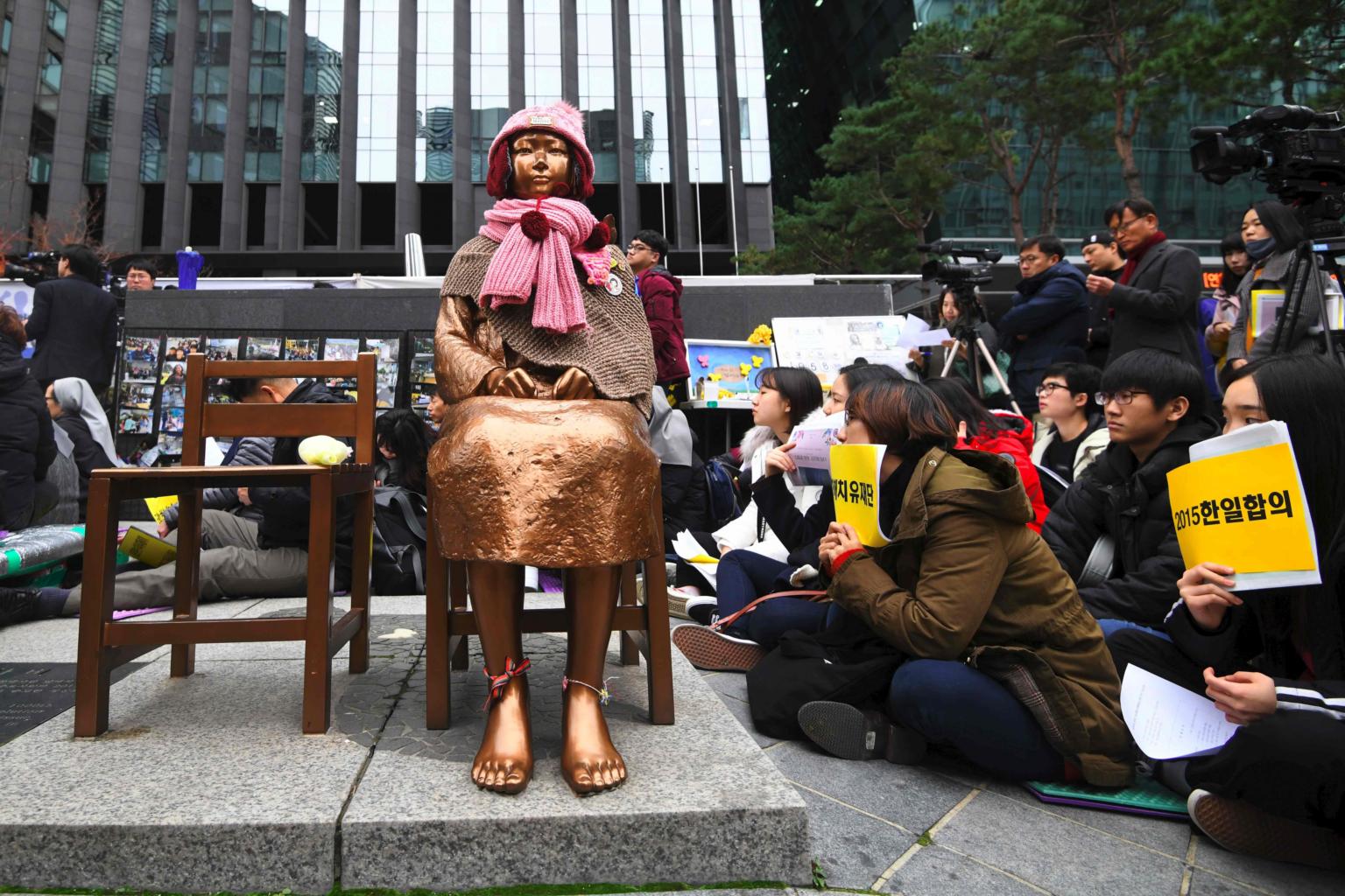 South Korean protesters sit near a statue of a teenage girl symbolising former "comfort women", during a weekly anti-Japanese demonstration in front of the Japanese embassy in Seoul, on Nov 21, 2018.