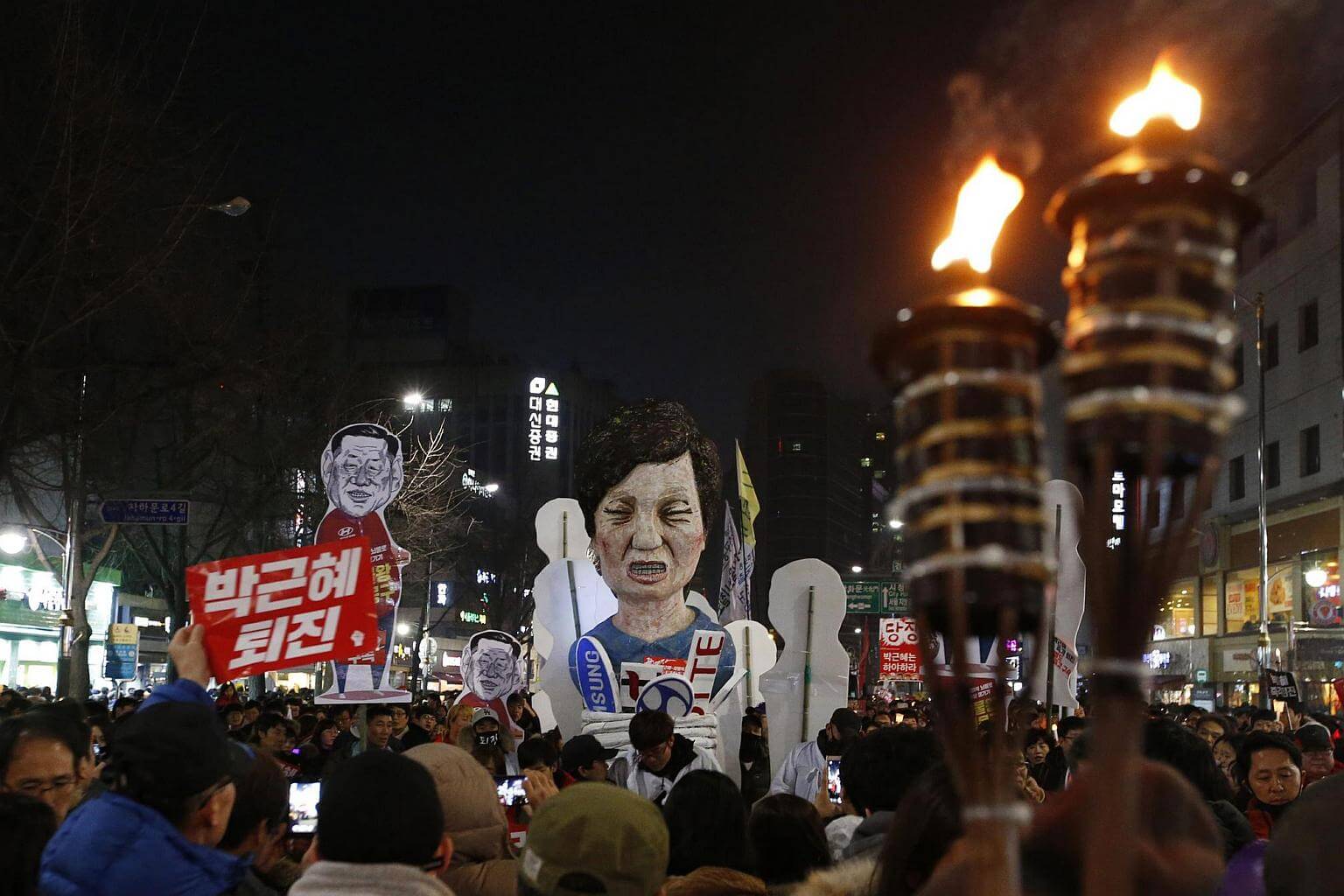 South Koreans with placards reading 'Park Geun-Hye Out' march in a torchlight procession toward the presidential house during a rally against president Park Geun-hye on the main street in Seoul.