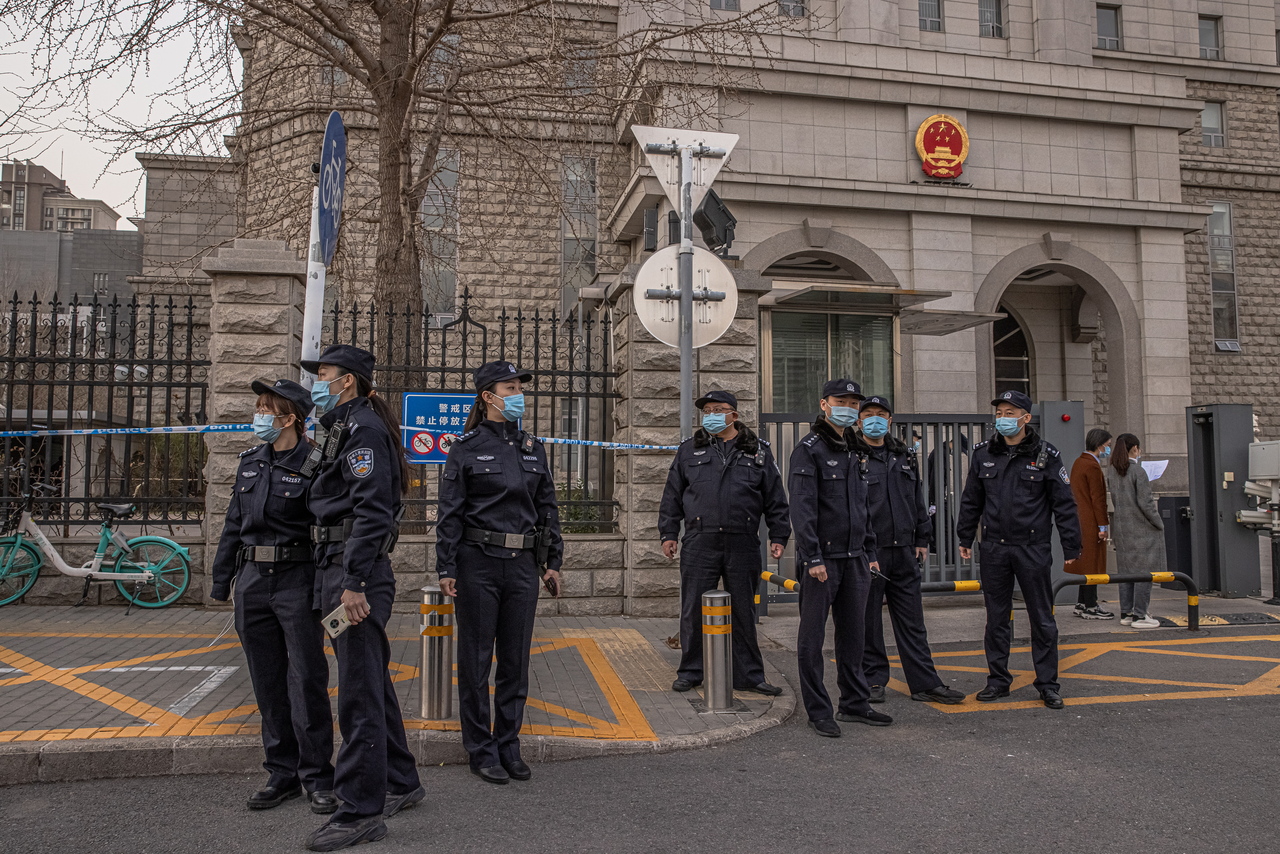 Police officers stand guard outside Intermediate People's Court where Canadian Michael Kovrig is expected to be on trial in Beijing, on March 22, 2021.
