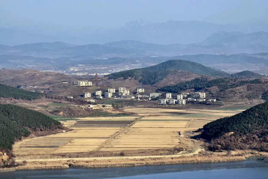 The North Korean village houses some 20 three-storey high buildings that look like residences, with a single-storey building that looks like a school, a plaza and rice fields near the riverbank.