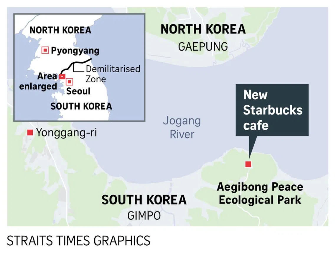 The cafe’s Starbucks signage - a symbol of Western culture and capitalism - is highly visible from the North Korean side.
