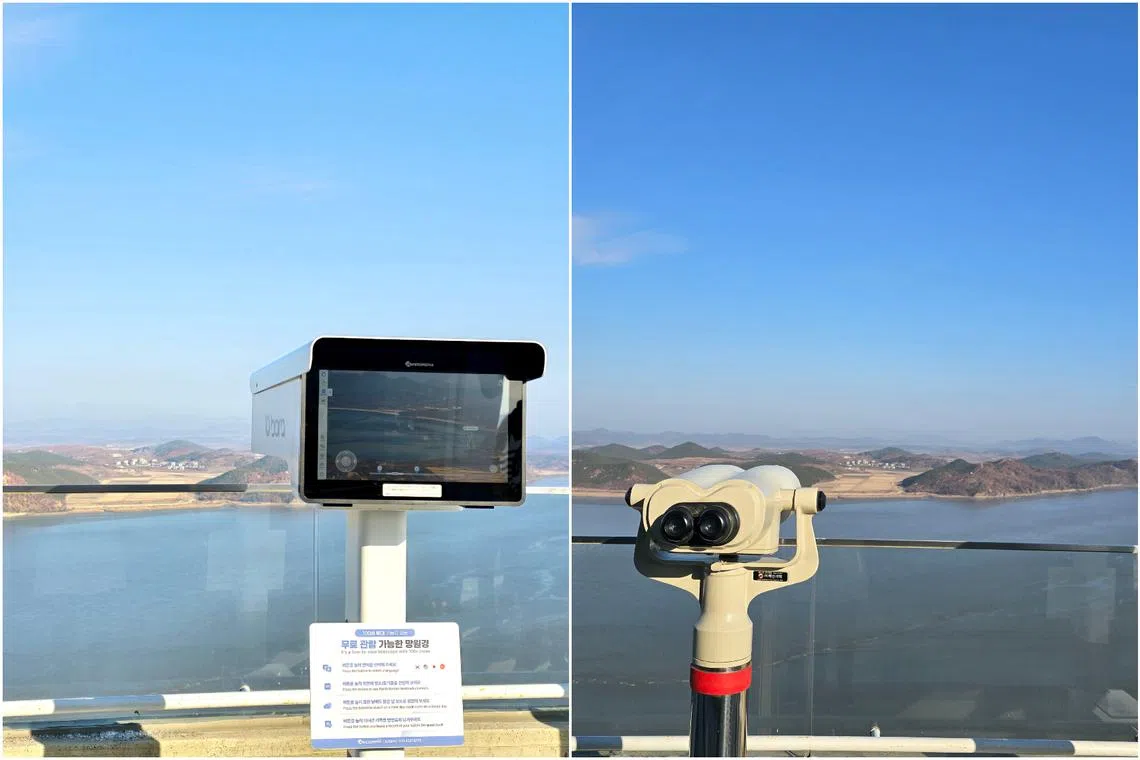 Visitors checking out the North Korean village via telescopes at the cafe (left) and at the Aegibong Peace Ecopark (right).