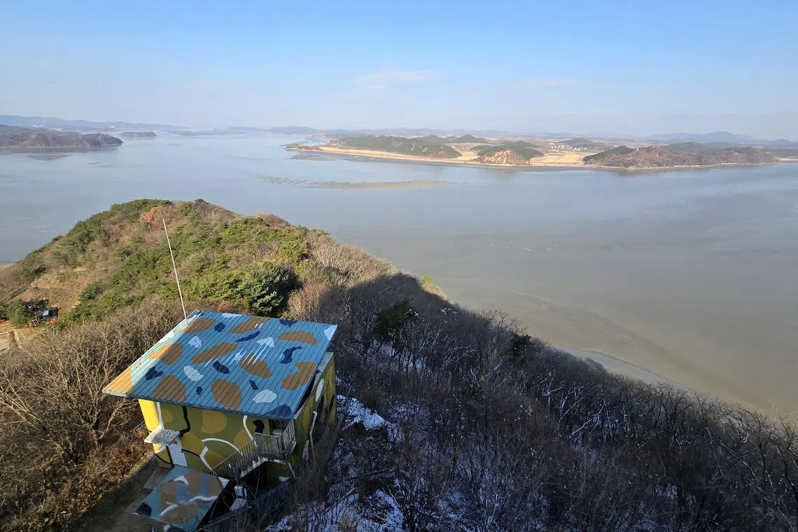 The cafe’s location allows visitors to have an unfettered view of a small village in North Korea’s Gaepung county just 1.4km away, so near that the number of buildings in the village can be counted.