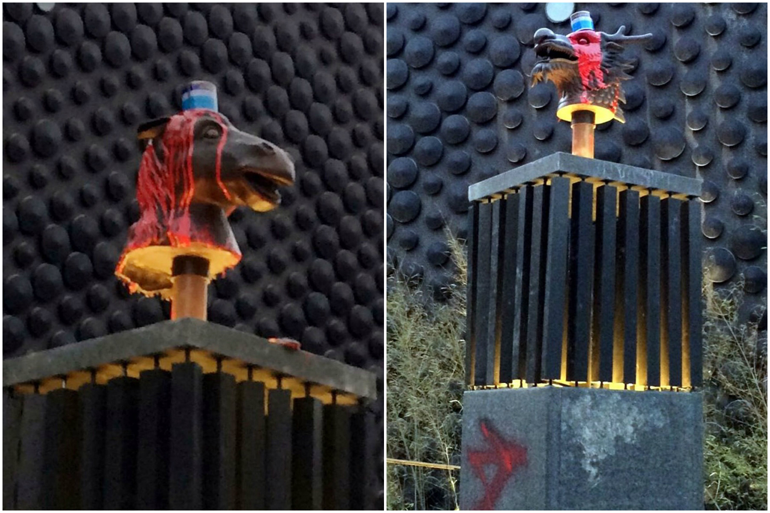A horse (left) and dragon statue defaced with red paint outside the National Palace Museum.