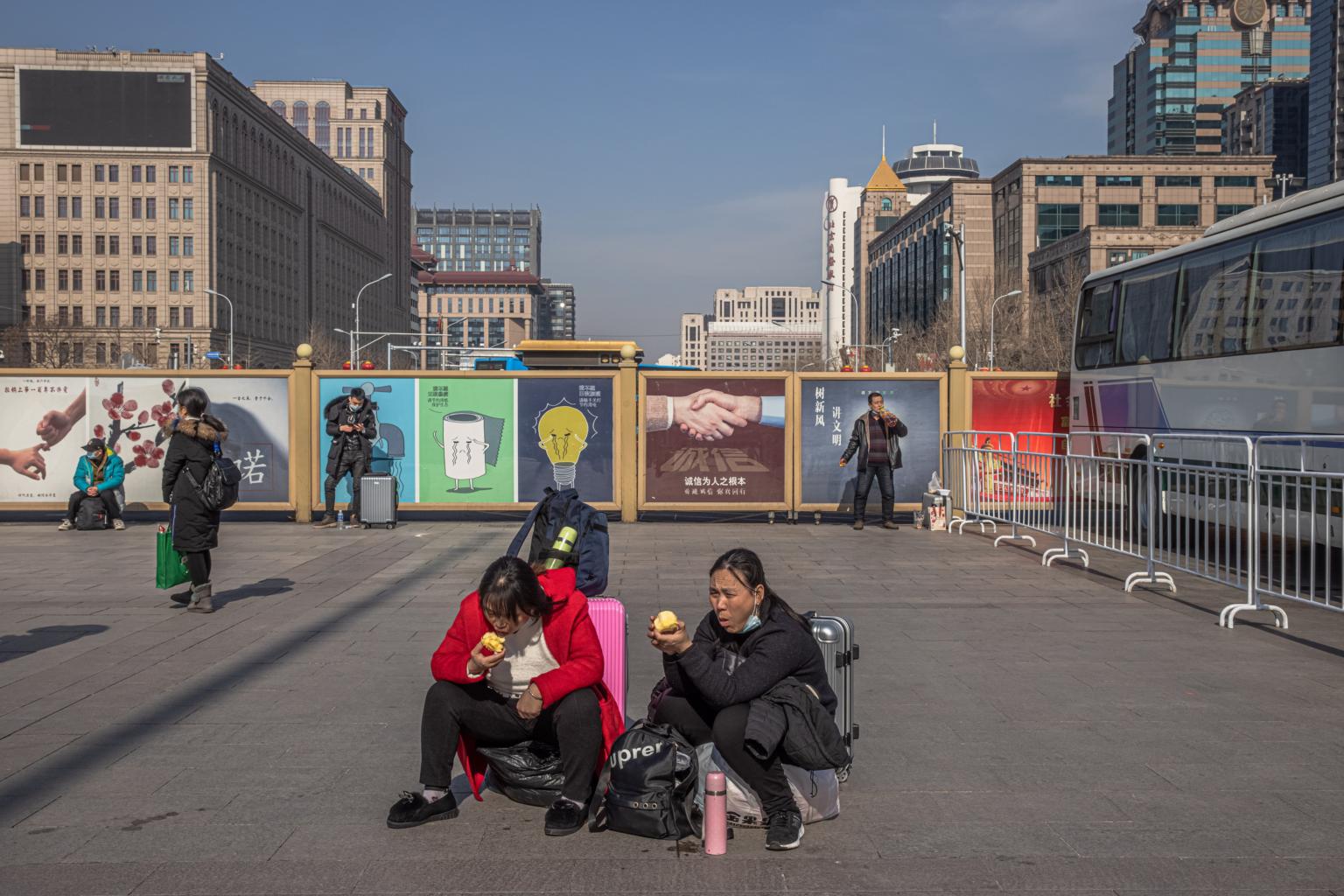 Passengers wait outside the Beijing Railway Station, on Feb 10, 2021.