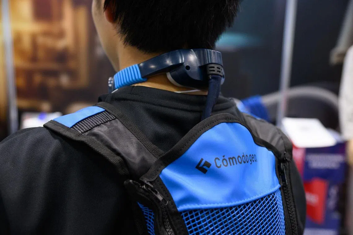 An employee using a Fujitsu General wearable air-conditioner at the Heat Solution expo in Tokyo on July 26.