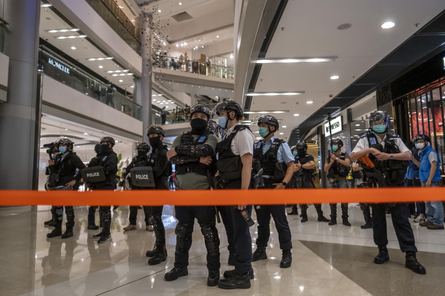 RIot police stand guard in a mall in Hong Kong on April 28, 2020.