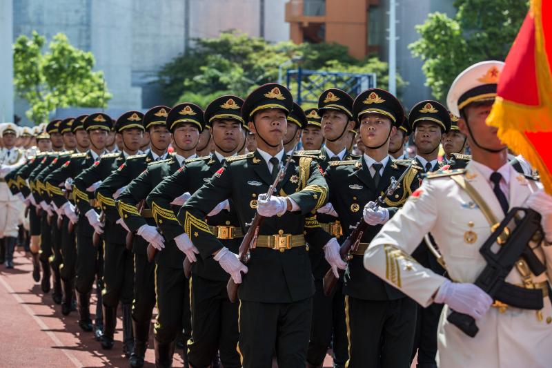 Soldiers of the Peoples' Liberation Army march during an open day at the Ngong Shuen Chau Barracks in Hong Kong on June 30, 2019.
