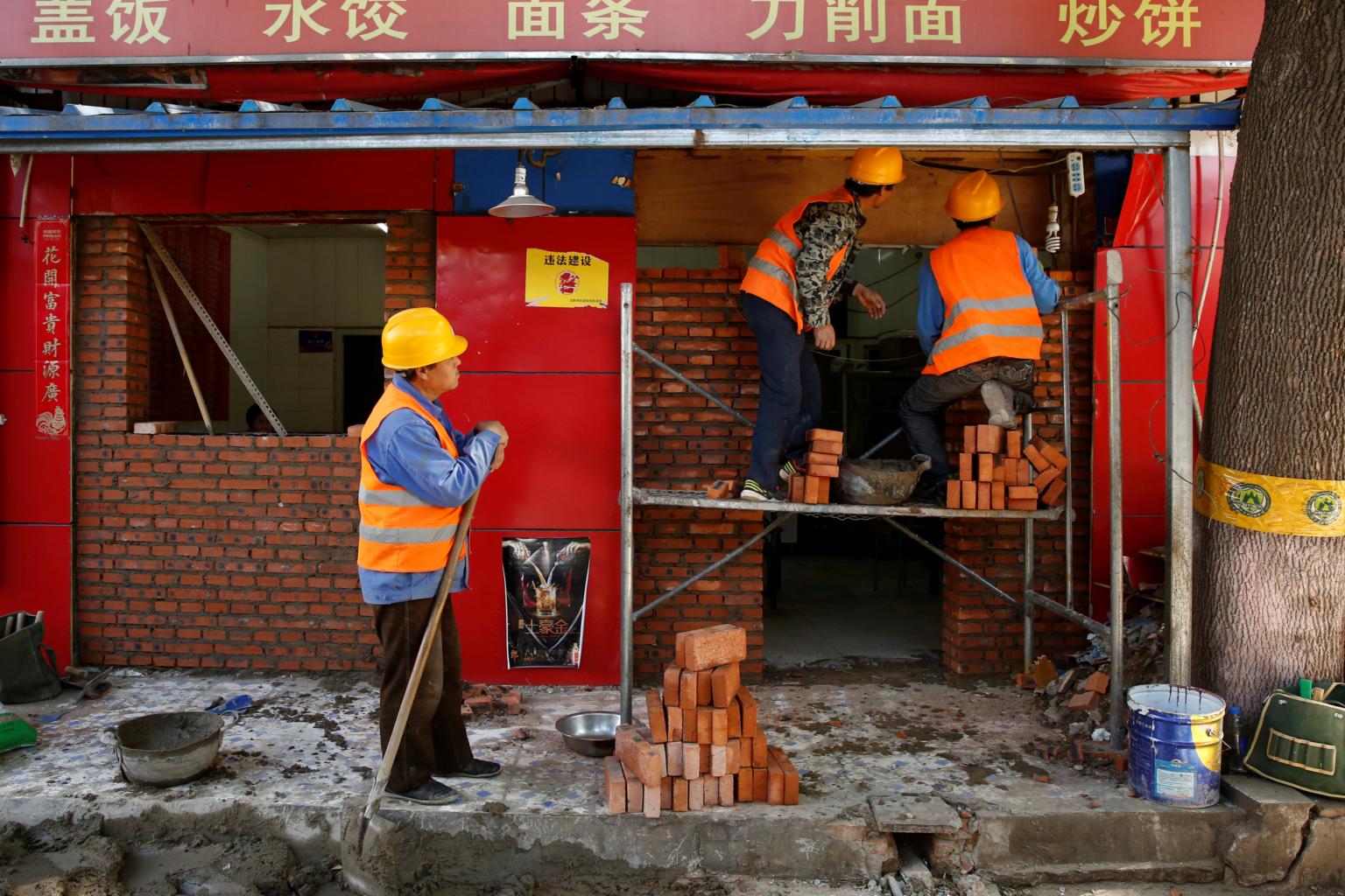 Workers building a brick wall across the front of a restaurant in a hutong alley in Beijing, China on May 5, 2017.