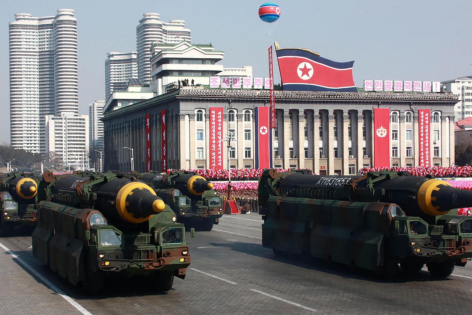 Ballistic missiles on display during a military parade in Pyongyang, on Feb 8, 2018.