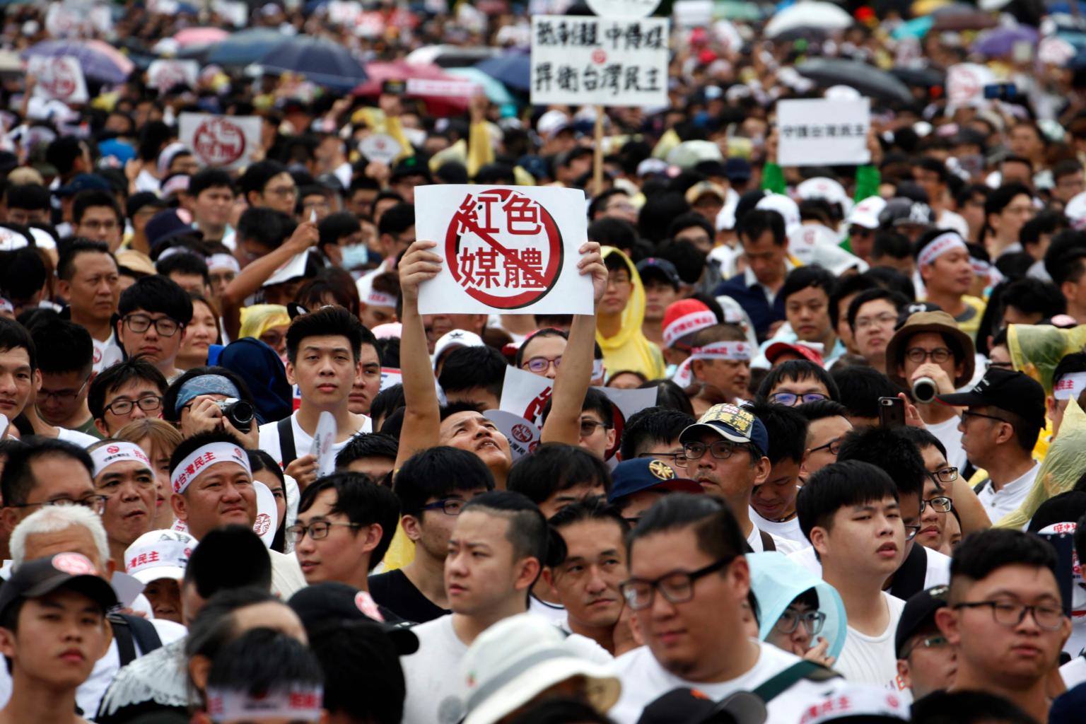 Protesters hold placards with messages that read "reject red media" during a rally in front of the Presidential Office building in Taipei, on June 23, 2019.