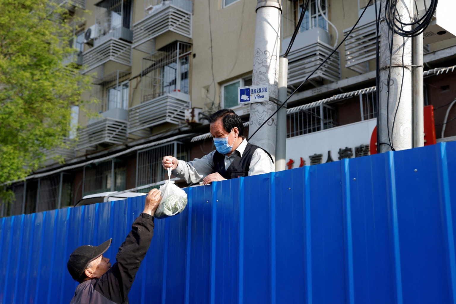 A man receives a bag of vegetables from a residential compound under lockdown in Beijing on April 28, 2022.