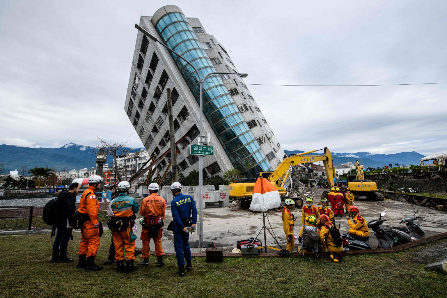 Rescue workers looking at the Yun Tsui building (centre), in Hualien after the Taiwanese city was hit by a 6.4-magnitude quake late on Feb 6, 2018. The building's developer has been detained for negligent manslaughter.