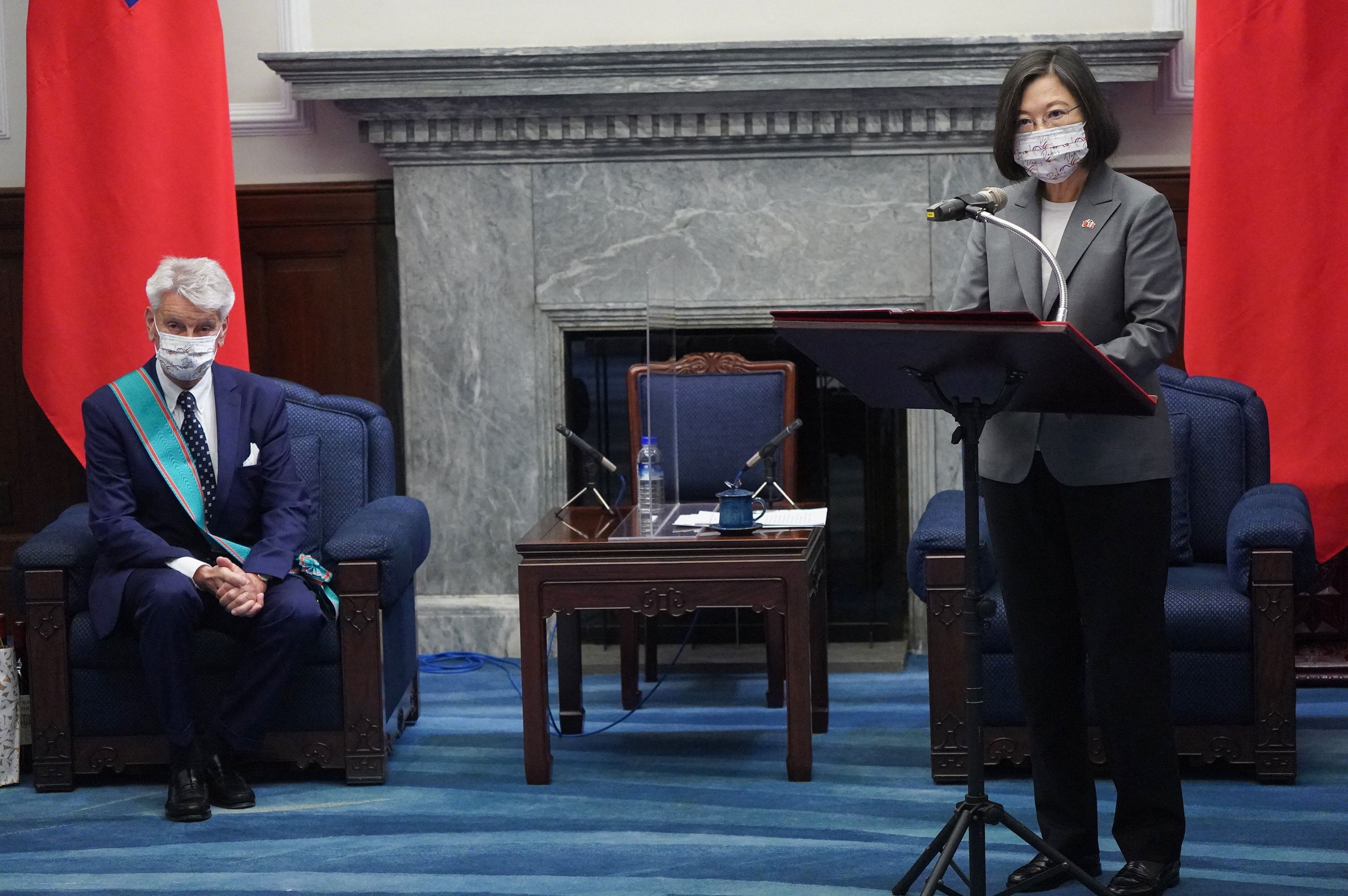 Taiwan President Tsai Ing-wen (right) speaks at the Presidential Office in Taipei on Oct 7, 2021.