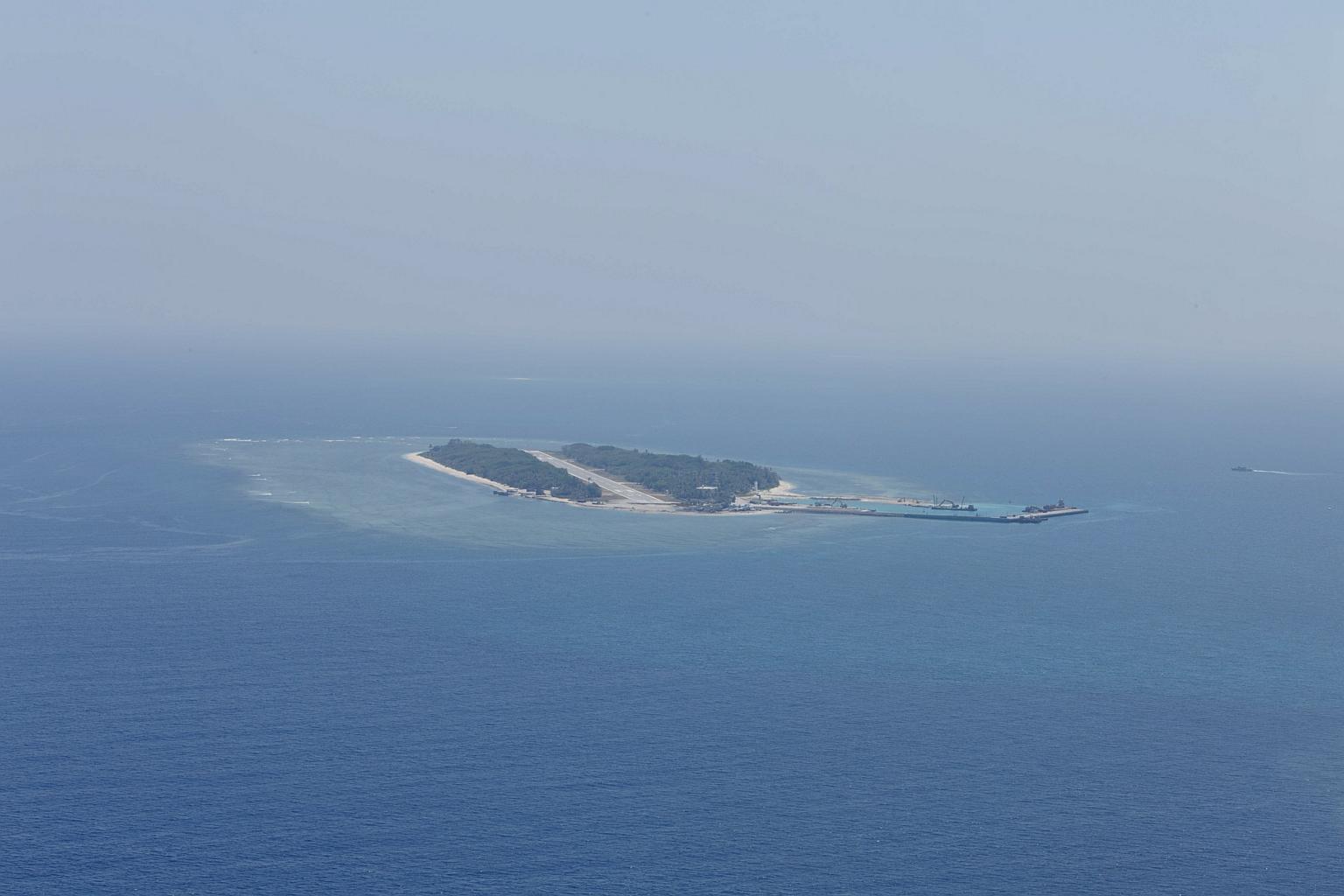 An aerial photo taken though a glass window of a Taiwanese military plane shows the view of Itu Aba, which the Taiwanese call Taiping, at the South China Sea, on March 23, 2016.