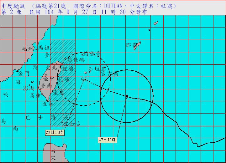 An image from the Central Weather Bureau shows Typhoon Dujuan approach Taiwan's east coast from the Pacific Ocean on Sept 27, 2015.