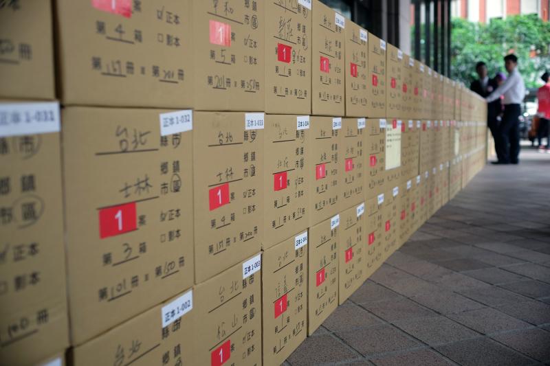 Boxes filled with anti-gay marriage petition signatures are placed in front of Taiwan's Central Election Commission in Taipei, on Aug 28, 2018.