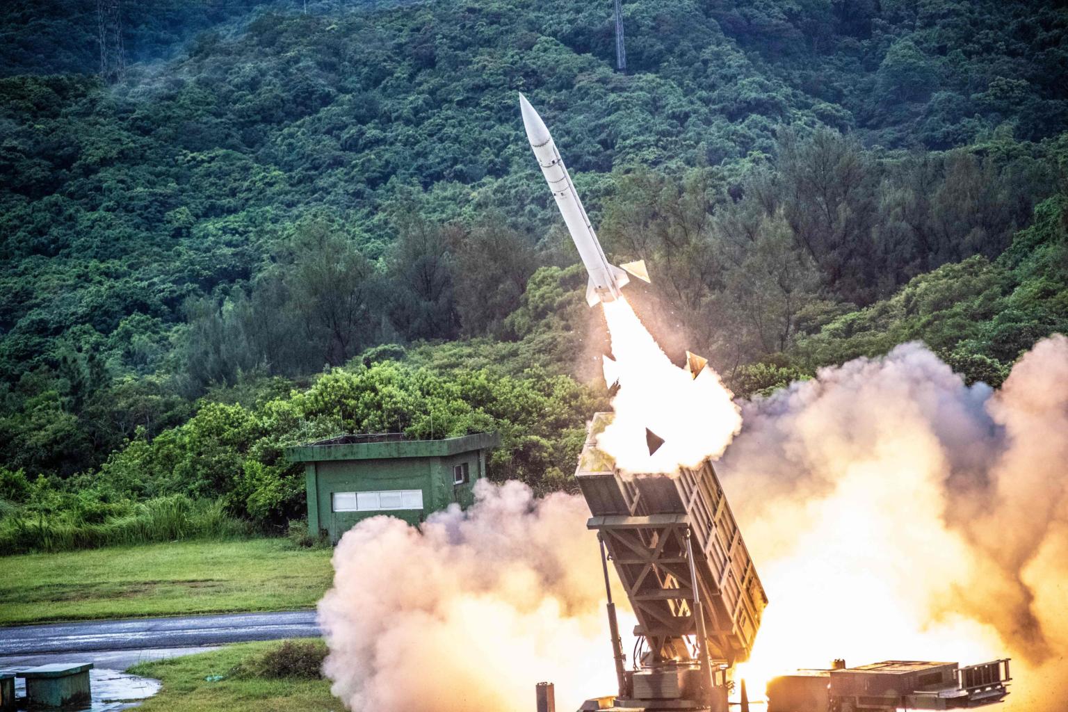 A domestically manufactured Hsiung Feng II missile being launched during the annual military drill in Taiwan on July 15, 2020.