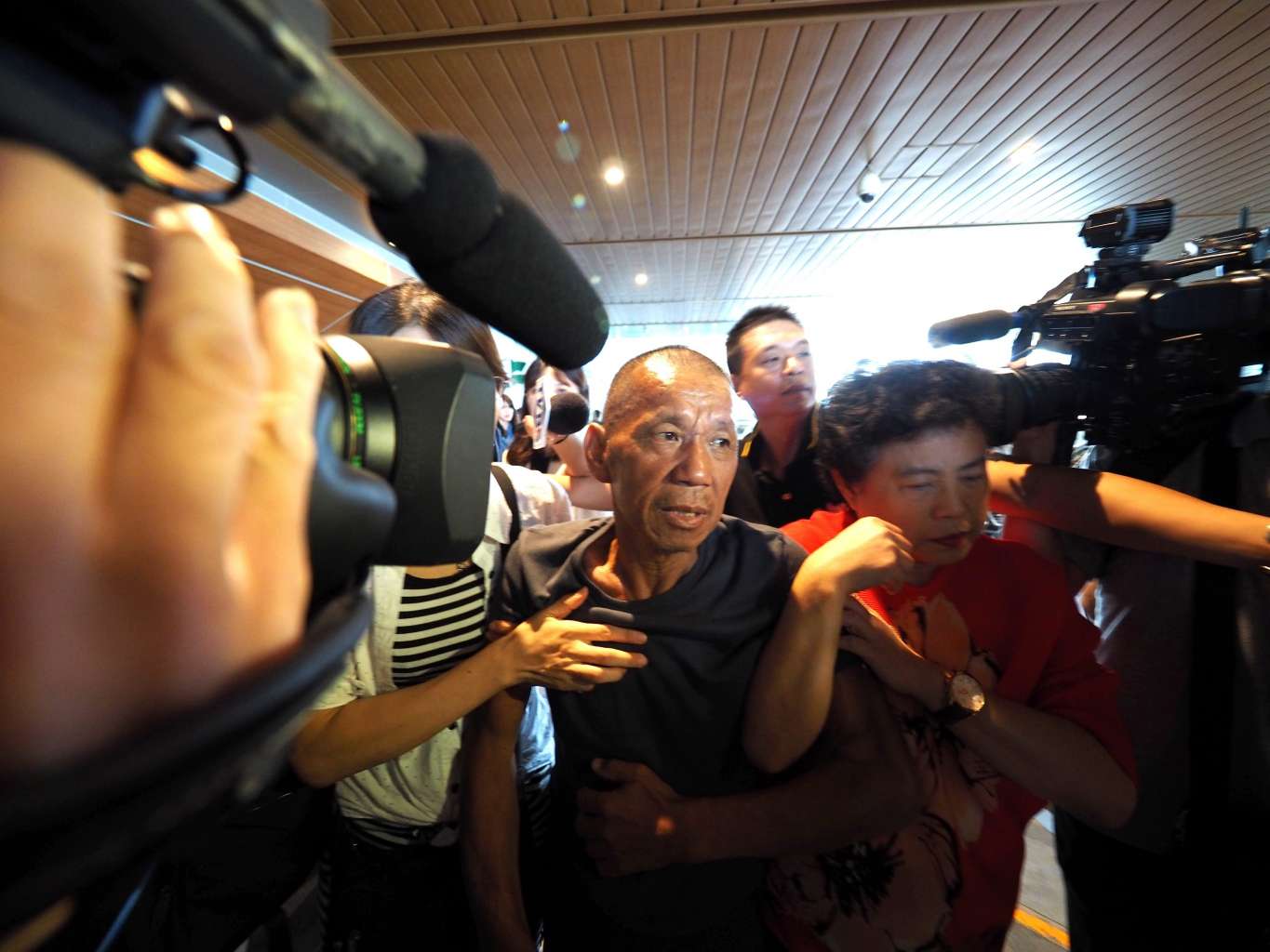 Former hostage Shen Jui-chang (centre) arriving at Taoyuan International Airport, near Taipei, on Oct 26, 2016.