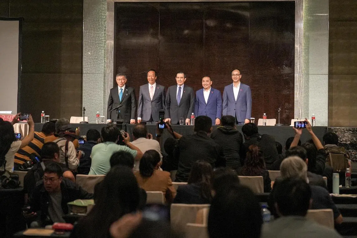 (From left) TPP chairman Ko Wen-je, Foxconn’s Terry Gou, former Taiwan president Ma Ying-jeou, KMT presidential candidate Hou Yu-ih and KMT Chairman Eric Chu at the Taipei press conference.