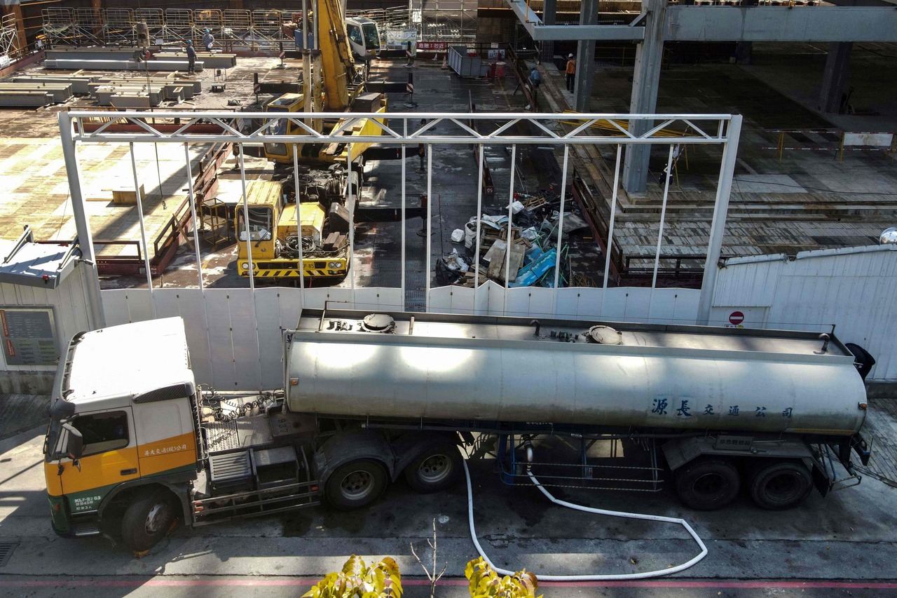 <p>This aerial photo taken on March 25, 2021 shows a water truck next to a construction site to receive underground water in Taichung, central Taiwan. - In the foothills of Taiwan's mountainous spine, reservoirs are running dry as the island experiences its worst drought in decades -- a crisis that risks deepening an already acute global semiconductor shortage. (Photo by Sam Yeh / AFP) / TO GO WITH Taiwan-economy-tech-chips-environment,FOCUS by Amber WANG</p>