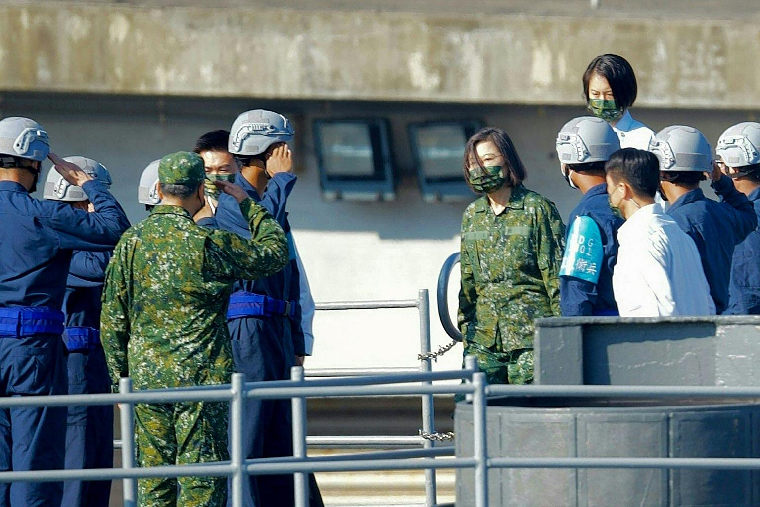 Taiwan President Tsai Ing-wen (centre, right) arrives on a destroyer during an annual drill in Yilan on July 26, 2022.