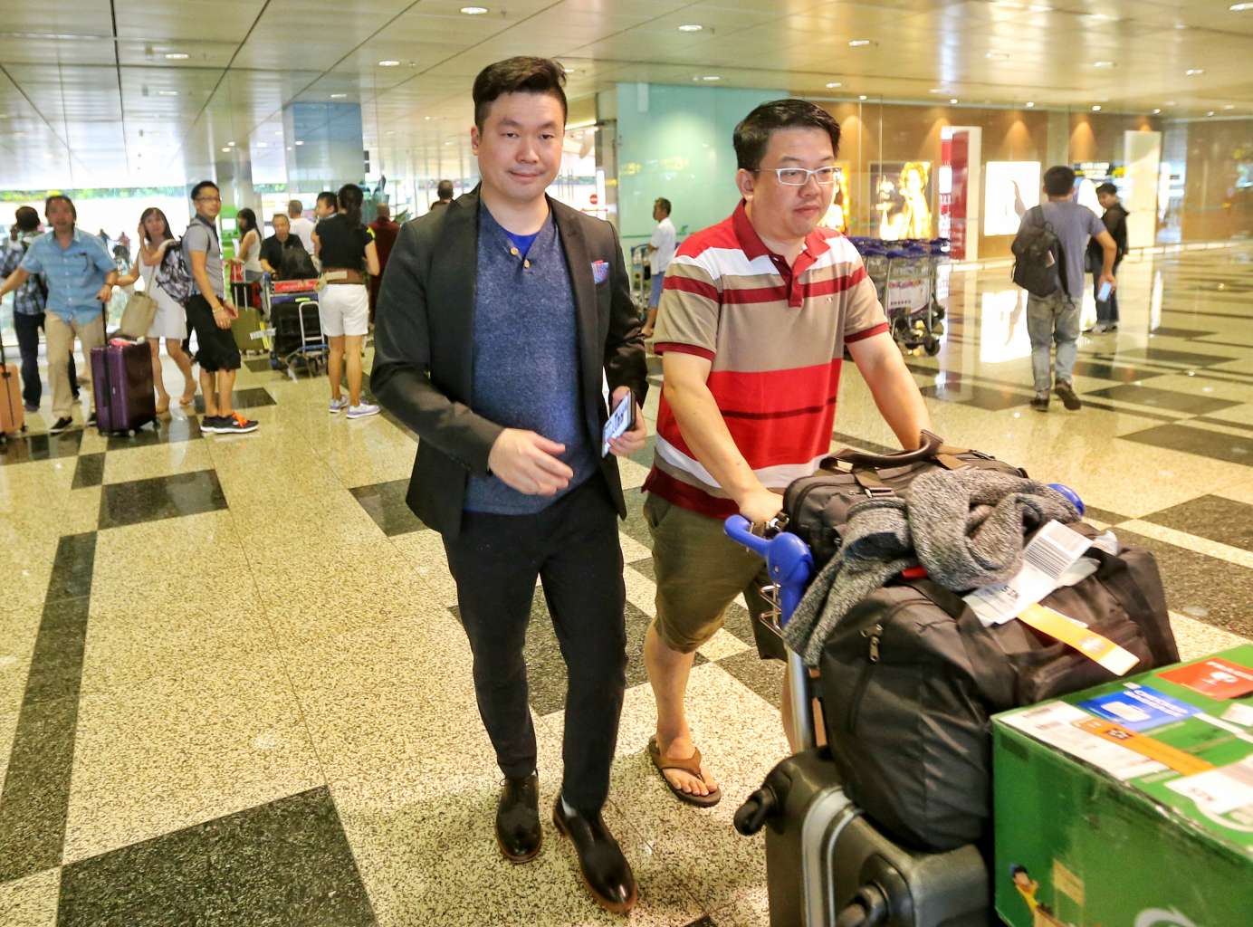Singaporean Luo Junfa (left), arriving at Changi Airport from Taiwan on Saturday (Feb 6) afternoon.