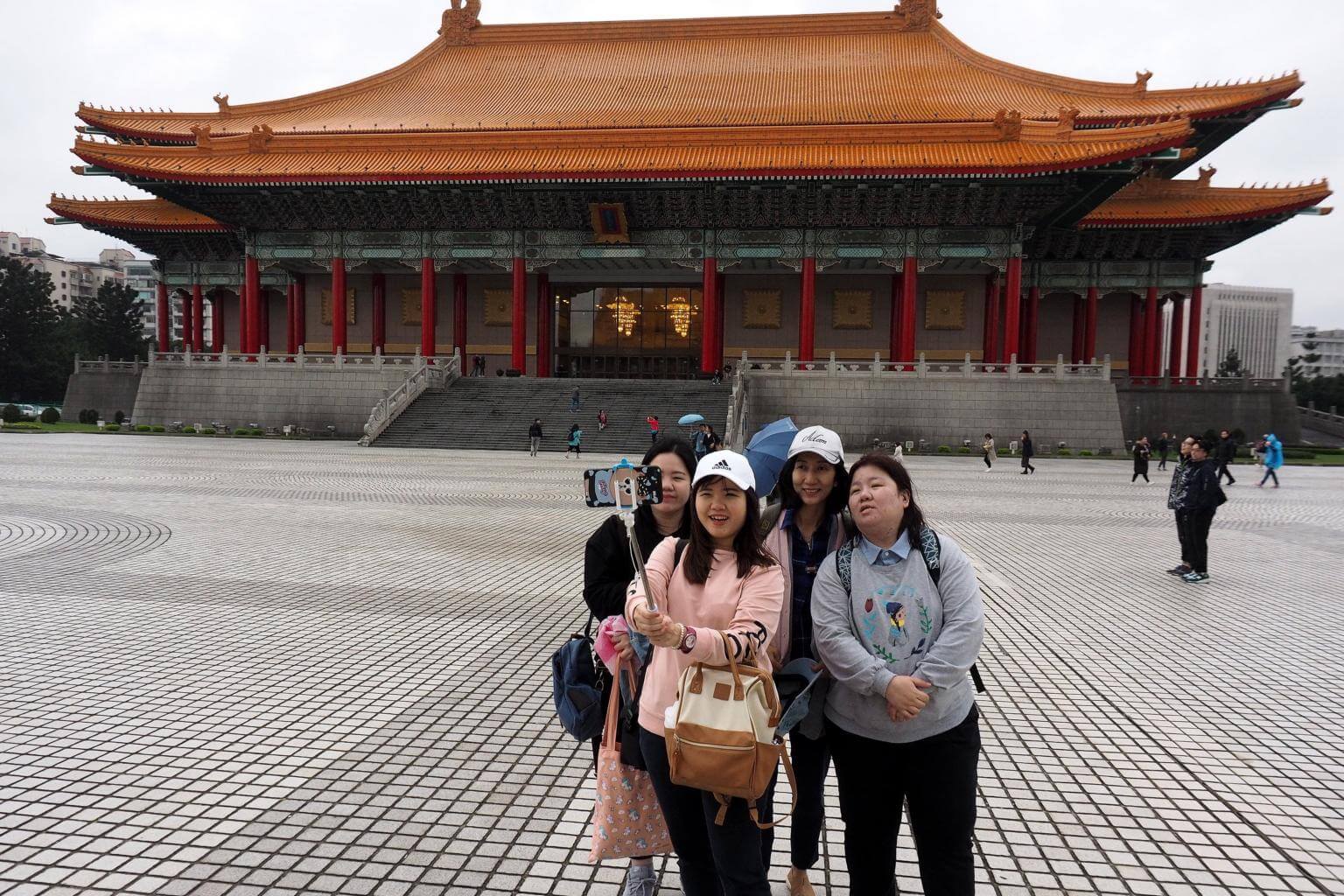 Tourists take a selfie in front of the National Concert Hall in Taipei, Taiwan, on Dec 28, 2018.