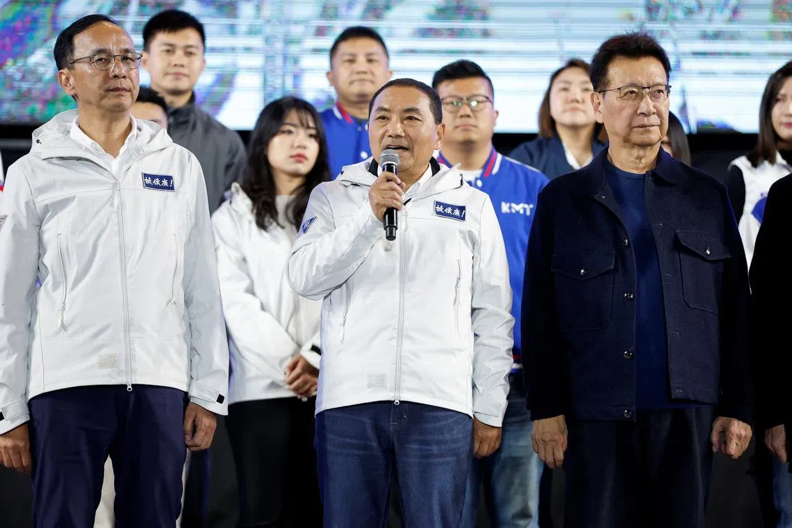 Kuomintang presidential candidate Hou Yu-ih (centre) speaking on stage next to vice-presidential candidate Jaw Shaw-kong in New Taipei City on Jan 13. Mr Hou has conceded defeat.