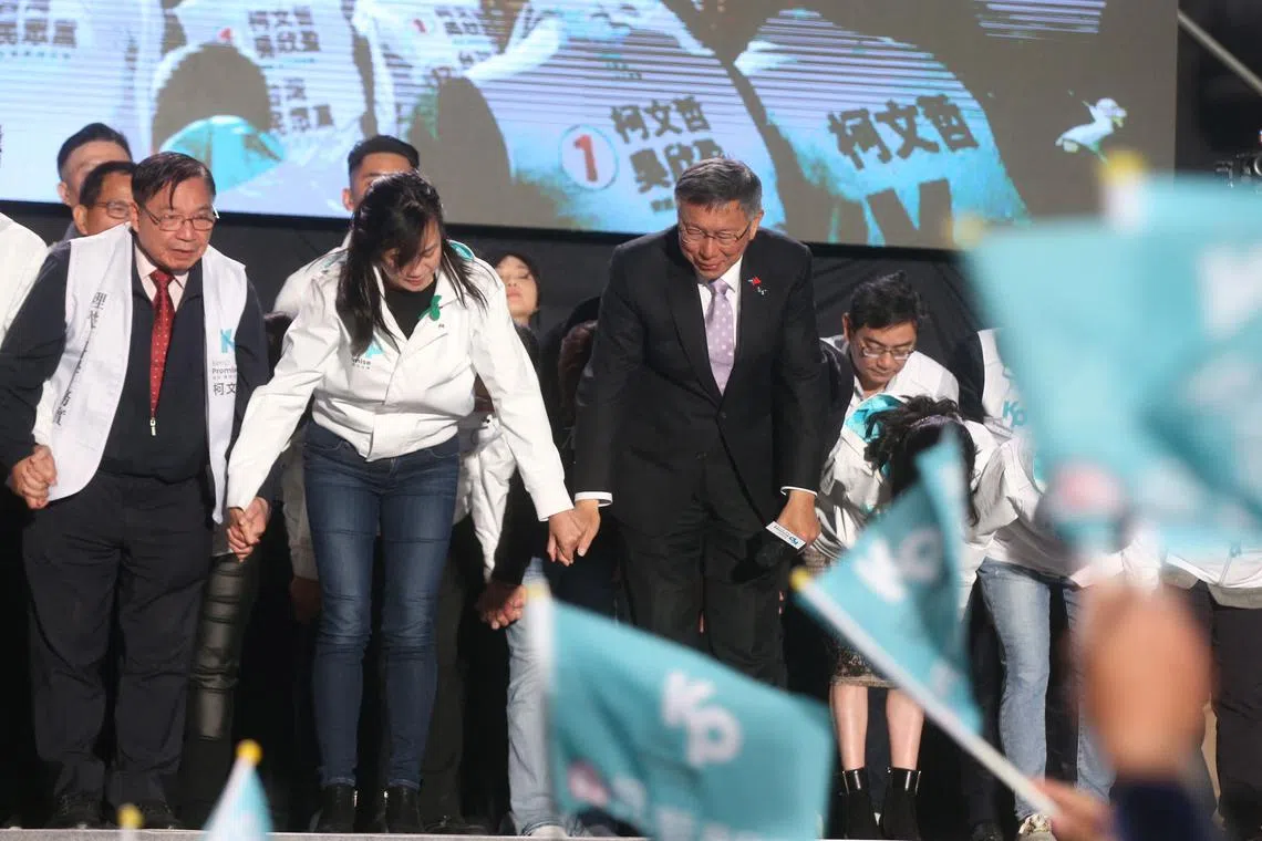 Taiwan People’s Party presidential candidate Ko Wen-je (centre) and his running mate Cynthia Wu bowing to supporters at the party’s headquarters in New Taipei City on Jan 13.