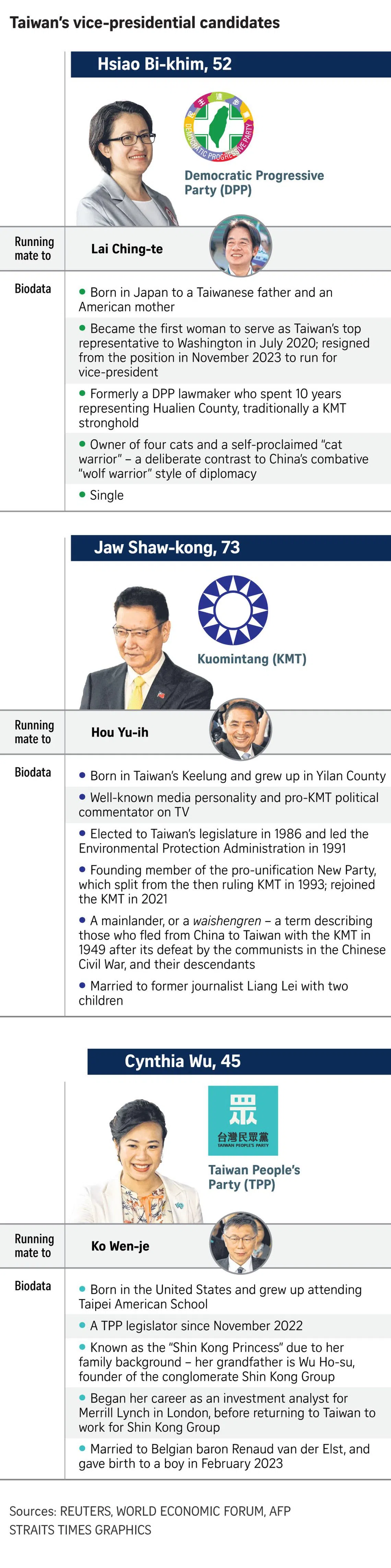 He said Ms Hsiao’s strong foreign policy experience is a boon for the Lai campaign, while KMT hardliner Jaw appeals to party supporters, many of whom prefer friendlier ties with China and are sceptical of Mr Hou because of his native Taiwanese background.