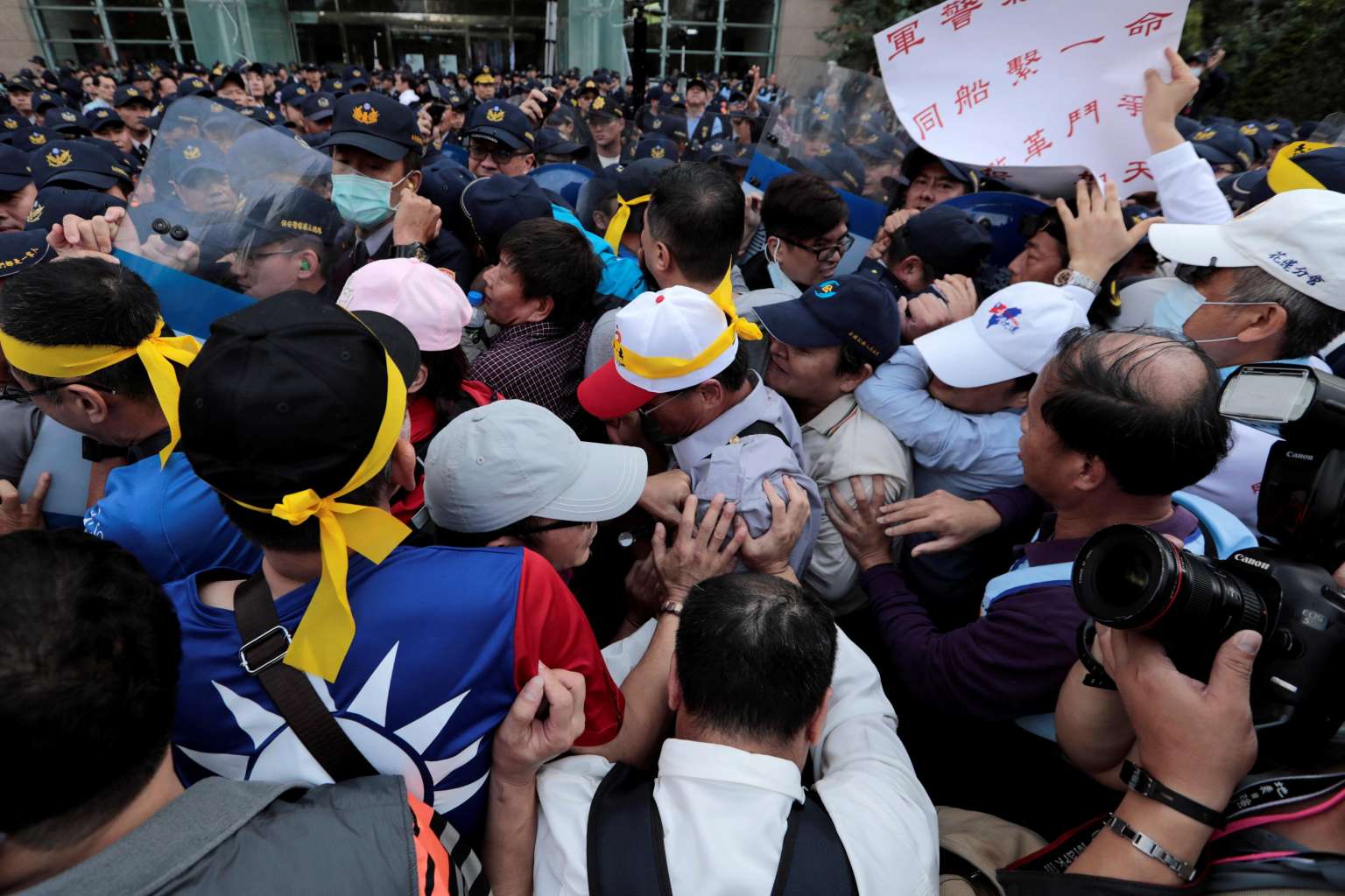 Taiwanese protesters clashing with police during a rally against an overhaul of pension funds, in Taichung on Jan 7, 2017.