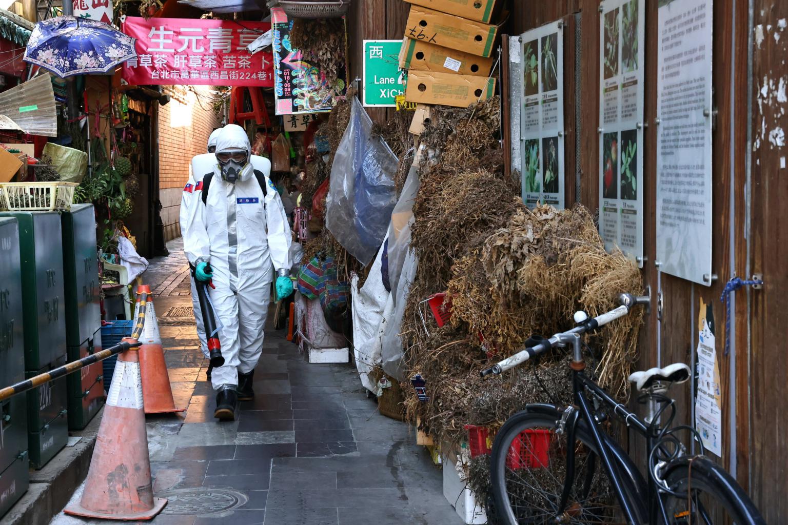 Soldiers disinfecting Wanhua district, an area that has one of the most Covid-19 cases, in Taipei, Taiwan, on May 16, 2021.