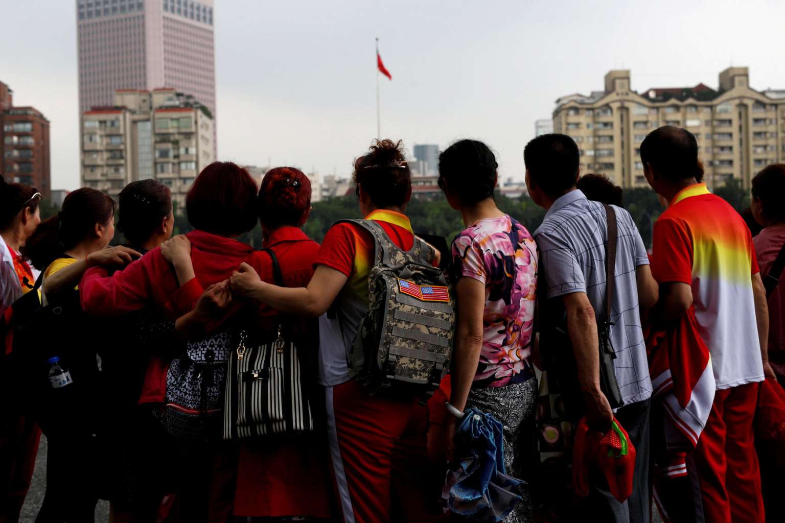 Tourists from China pose for a group photo in front of a Taiwanese flag, in Taipei, on May 5, 2016.