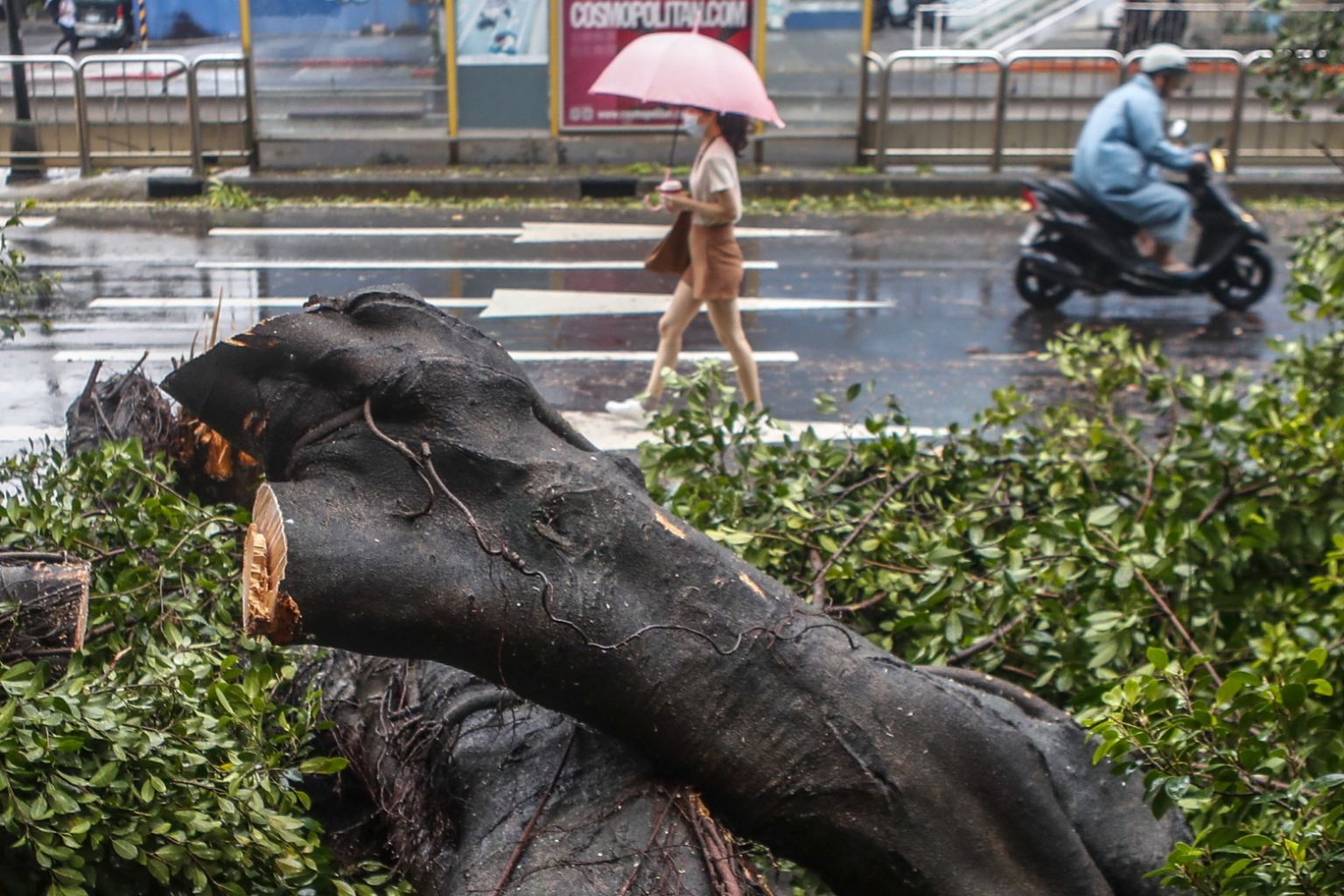 People walk past a fallen tree after it was knocked over by typhoon Maria in Taipei, Taiwan, on July 11, 2018.