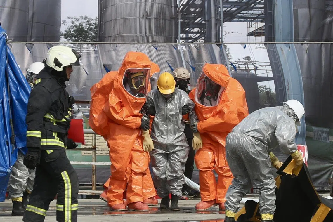 In another drill, coloured gas was released to simulate a chemical attack, in which a crew of hazmat-suited responders saved an unconscious civilian caught in the crossfire.