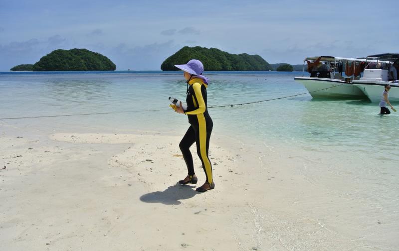 File photo showing a Chinese tourist walking on a beach on the Rock Islands in Palau, on March 5, 2015.