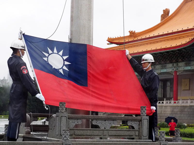 Soldiers hoist Taiwan's national flag at Liberty Square in Taipei on June 14, 2019.