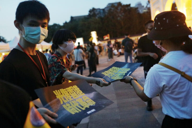 Volunteers hand out posters supporting the Hong Kong anti-government movement to people in Taipei.