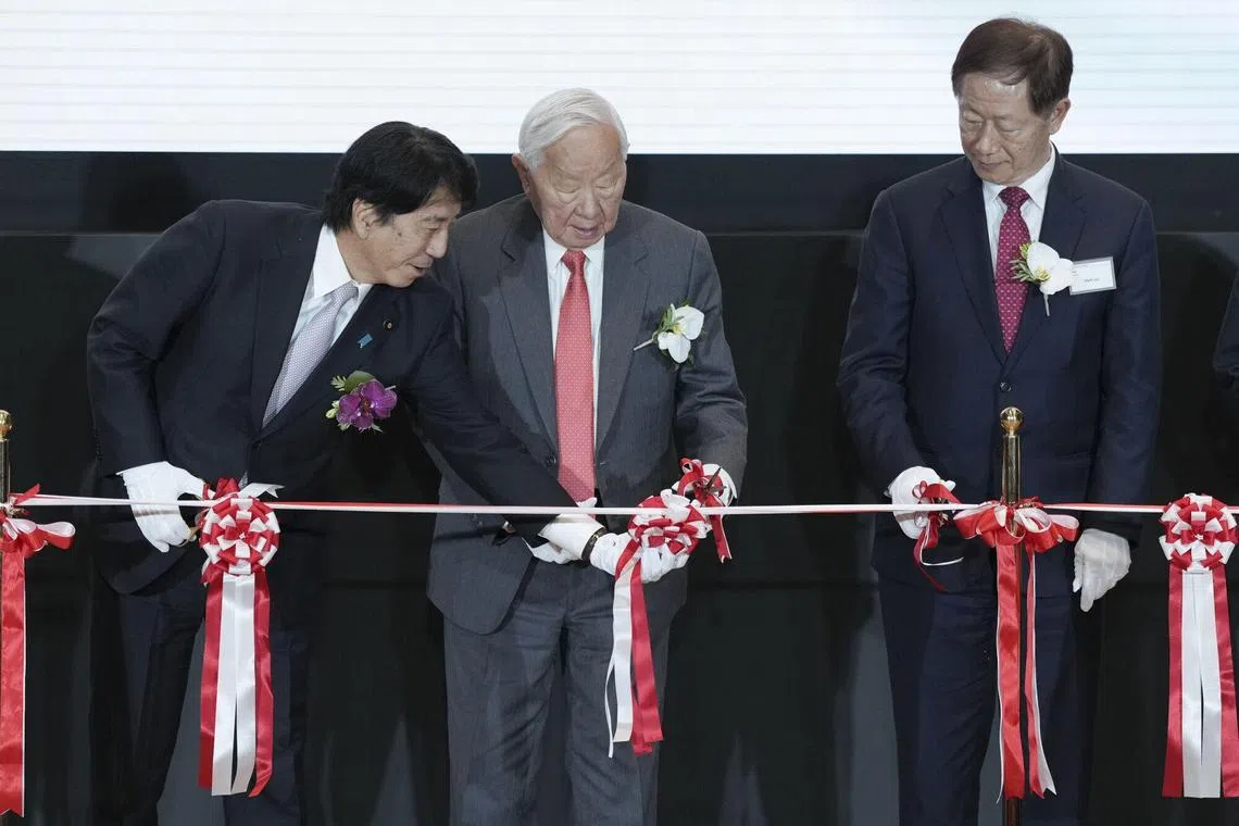(From left) Mr Ken Saito, Japan’s Minister of Economy, Trade and Industry; Dr Morris Chang, founder of TSMC; and Dr Mark Liu, chairman of TSMC, attend the opening ceremony for the new factory.