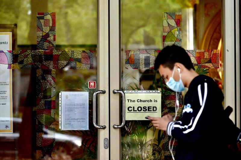 A photo taken on March 17, 2020 shows a man wearing a face mask next to signs informing visitors that the church is closed due to the Covid-19 coronavirus outbreak, at the entrance to the St. Christopher Church in Taipei.