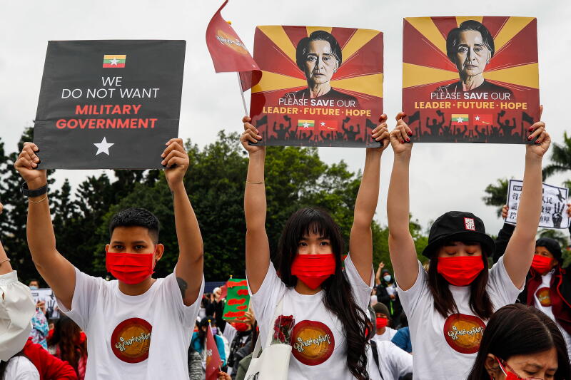 Dressed in white, the colour of mourning, and holding pictures of detained leader Aung San Suu Kyi and signs condemning the coup, around 400 people protested at Taipei's Liberty Square, mainly Sino-Burmese but also non-Chinese Myanmar citizens, Taiwanese and Hong Kongers.