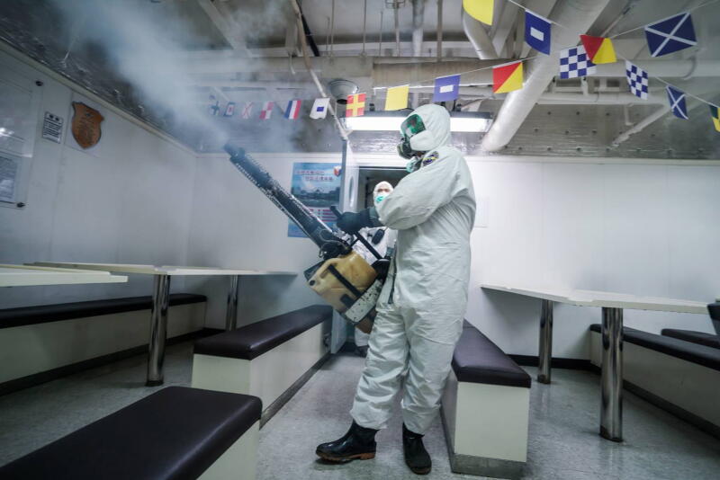 Soldiers disinfect the Panshi supply ship in Kaohsiung, Taiwa, on April 19, 2020.