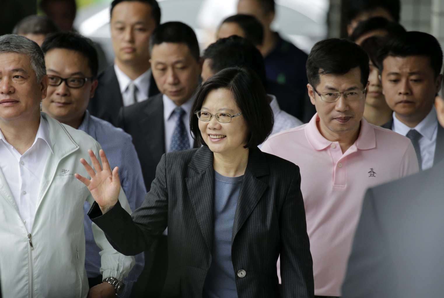 Taiwan President Tsai Ing-wen (centre) waves to supporters as she arrives to vote for party officials in Taipei, Taiwan, on May 22, 2016.