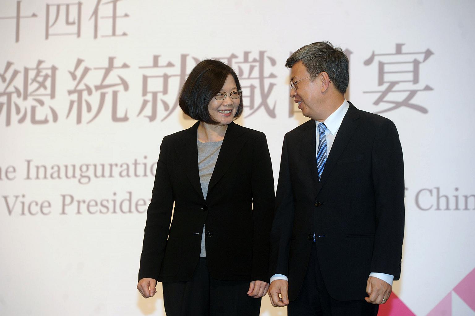 Taiwan's new President Tsai Ing-wen chatting with Vice-president Chen Chien-jen during a banquet in Taipei.