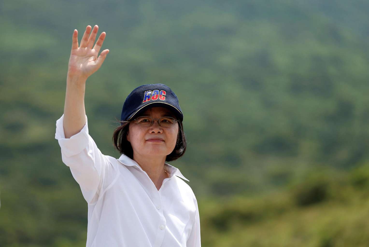 Taiwanese President Tsai Ing-wen waves after the annual Han Kuang military drill simulating the China's People's Liberation Army invading the island, in Pingtung county, southern Taiwan.