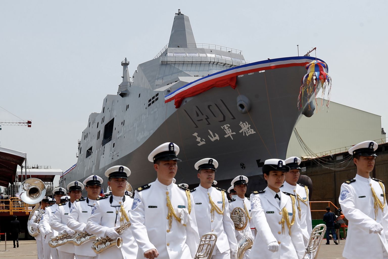 Members of an honour guard at the launch of Taiwan’s new amphibious transport dock, named Yu Shan, in Kaohsiung last week.