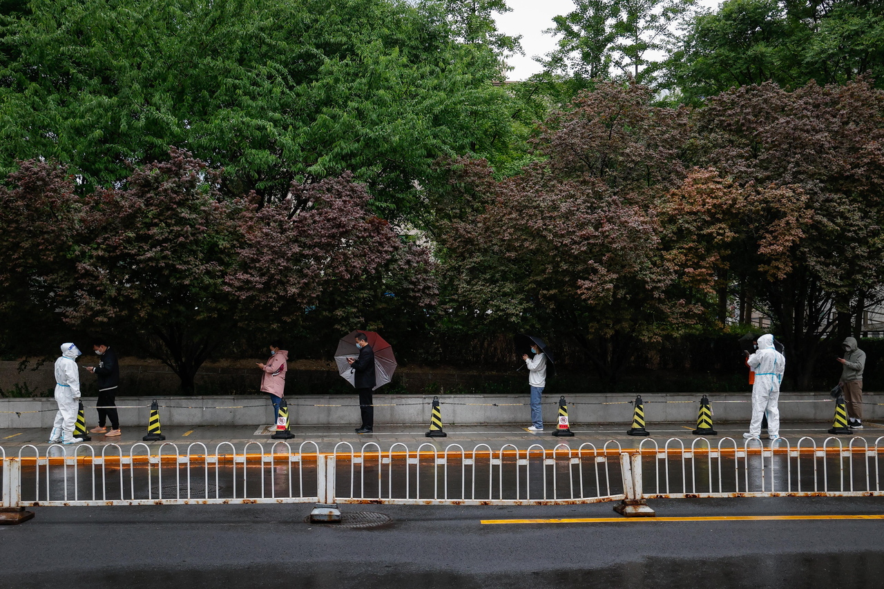 People line up for a Covid-19 test in Beijing on April 27, 2022.