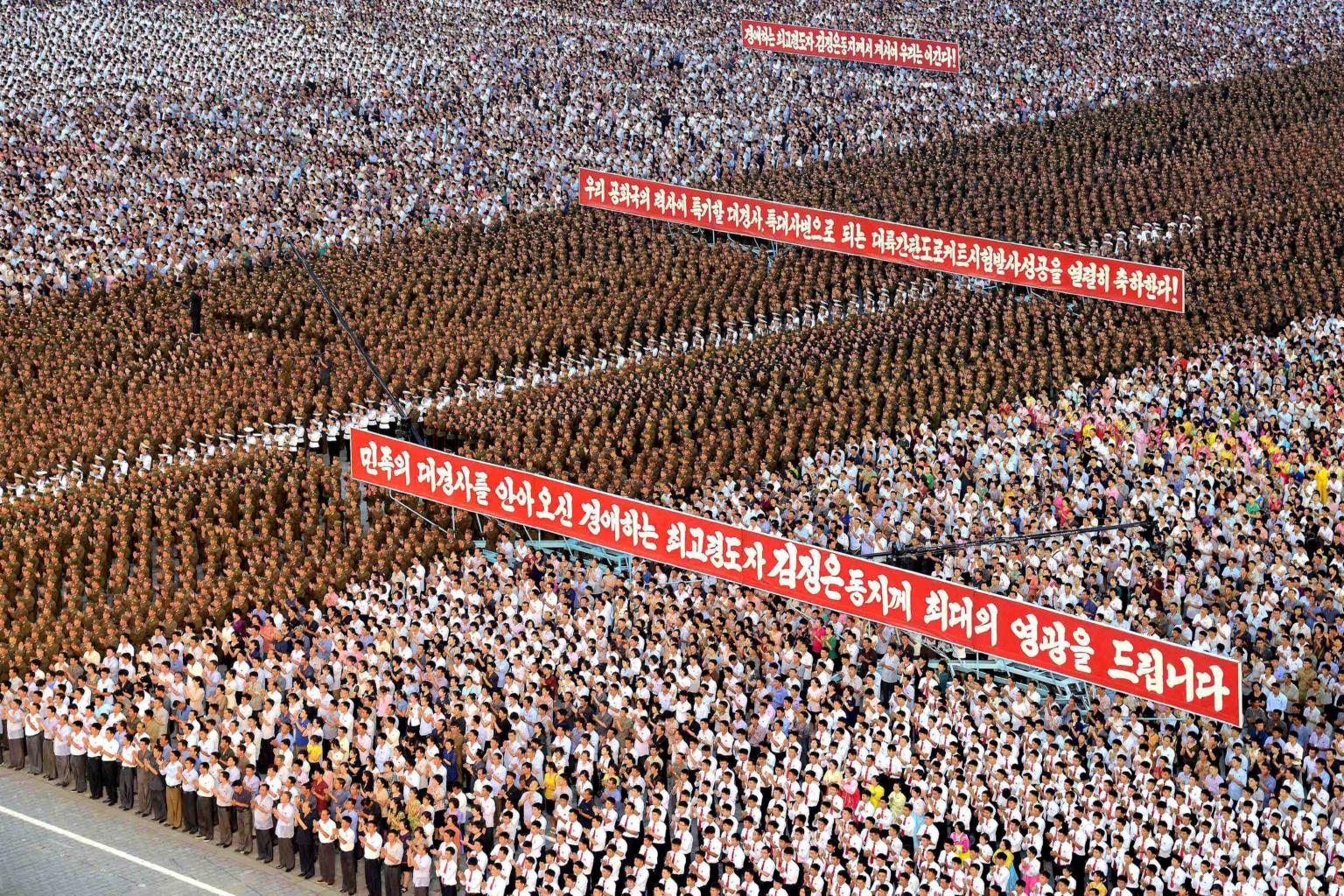 Army personnel and people gather for a celebration at Kim Il Sung Square in Pyongyang on July 6, 2017.